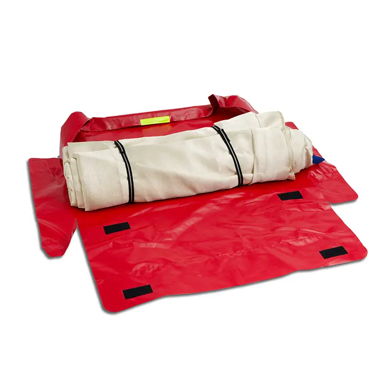 2-piece fire containment set consisting of: 1 x fire containment blanket made of high-temperature fabric with a mineral coating on both sides, flexible, non-slip, four loops and corner reinforcement, dimensions: 6000 x 8000 mm, weight: 30 kg 1 x carrying bag for fire containment blanket dimensions: 270 x 270 x 1040 mm >1,300 °C