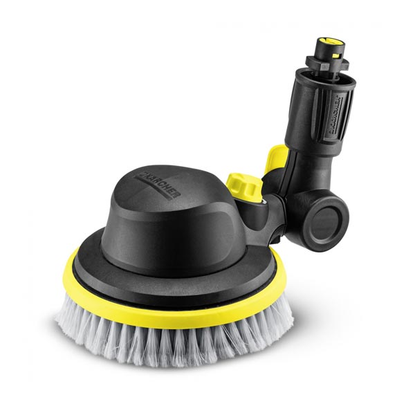 Rotating wash brush with connector ideal for cleaning all smooth surfaces, e.g. painted, glass or plastic. Wash brush with many practical features: rotating bristles with gentle cleaning action, infinitely adjustable 180° connection on the handle for cleaning hard-to-reach surfaces, infinitely adjustable speed and detergent dosage, easy-to-change brush attachment, outer protective ring for scratch protection and union nut for secure connection to the gun. In short: the ideal solution for smooth surfaces. The rotating wash brush is suitable for all Kärcher household high-pressure cleaners in the K 2 – K 7 series.