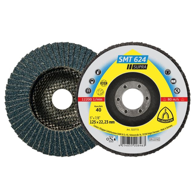 Surface processing on stainless steel and steel necessitates abrasive discs that are guaranteed to deliver a high removal rate and an aggressive stock removal rate. The flap disc SMT 624 Supra fits these requirements. It comes