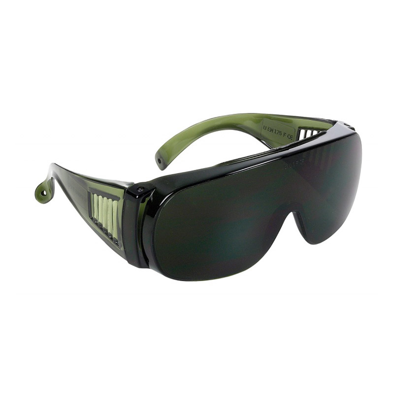 Spectacle with single lens, with lateral ventilation, hole for lanyard, stakable on eyeglasses.Green lens in polycarbonate for protection from mechanical impacts, and welding process.
