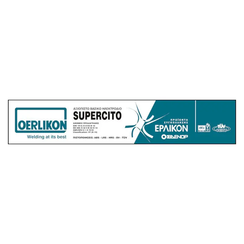 Ηλεκτρόδια Oerlikon (Έρλικον) Supercito, για σοβαρές κατασκευές με ραδιογραφικούς ελέγχους σε ανθρακούχους χάλυβες με άνθρακα μέχρι 0.4%. Βασική επένδυση με σκόνη σιδήρου. Απόδοση περίπου 120%. Για συναρμολογήσεις σωληνώσεων, πλοίων, γεφυρών, ικριωμάτων, οχημάτων, προκατασκευασμένων κτιρίων από χάλυβα, λεβήτων υψηλής πιέσεως, δεξαμενών καυσίμων κ.λπ. Επίσης για υπόστρωμα σε αναγομώσεις σκληρών χαλύβων.