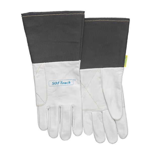 SOFTouch™ γάντια ηλεκτροσυγκολλητού από δέρμα κατσίκας, και γκρι μανσέτα από ύφασμα επιβράδυνσης φλόγας.